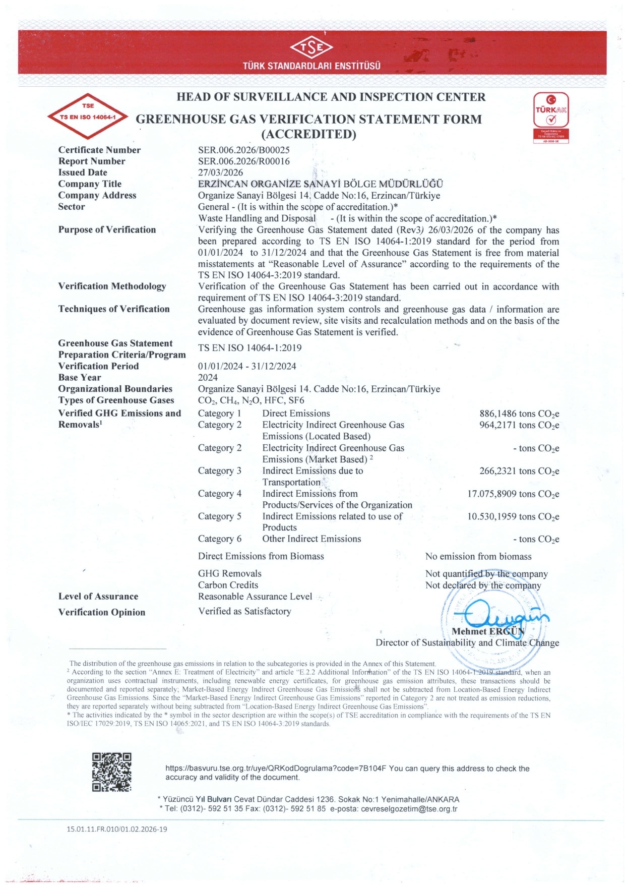Söz konusu belge ile birlikte, sera gazı emisyonlarının izlenmesi, raporlanması ve doğrulanmasına yönelik süreçler uluslararası standartlara uygun hale getirilmiştir. Bu gelişme, Erzincan OSB’nin iklim değişikliği ile mücadele ve sürdürülebilirlik hedefleri doğrultusunda attığı önemli adımlardan biri olmuştur.